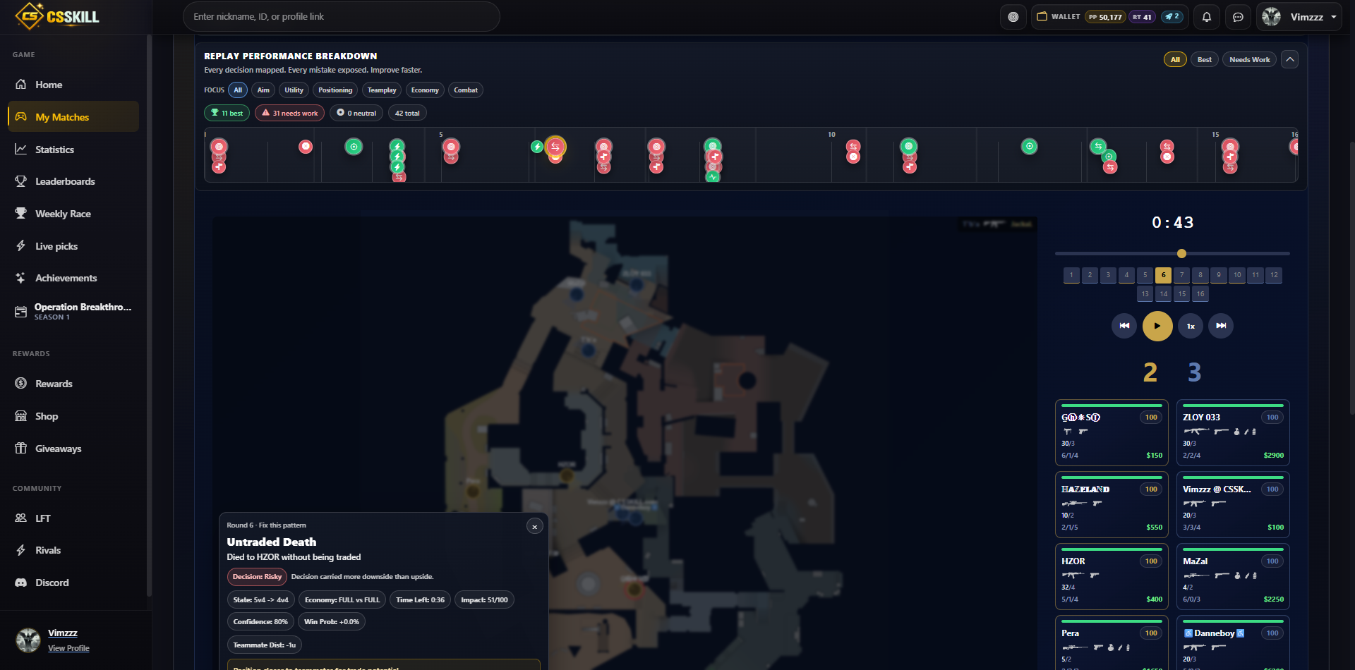 CSSkill.com gives you actionable feedback on all your plays during your matches in interactive 2D demo replays and game statistics that you can actually use to your advantage and improve on over time. All of our features a free to use forever and your matches are automatically imported wether its Premier, Matchmaking, Wingman or FACEIT.